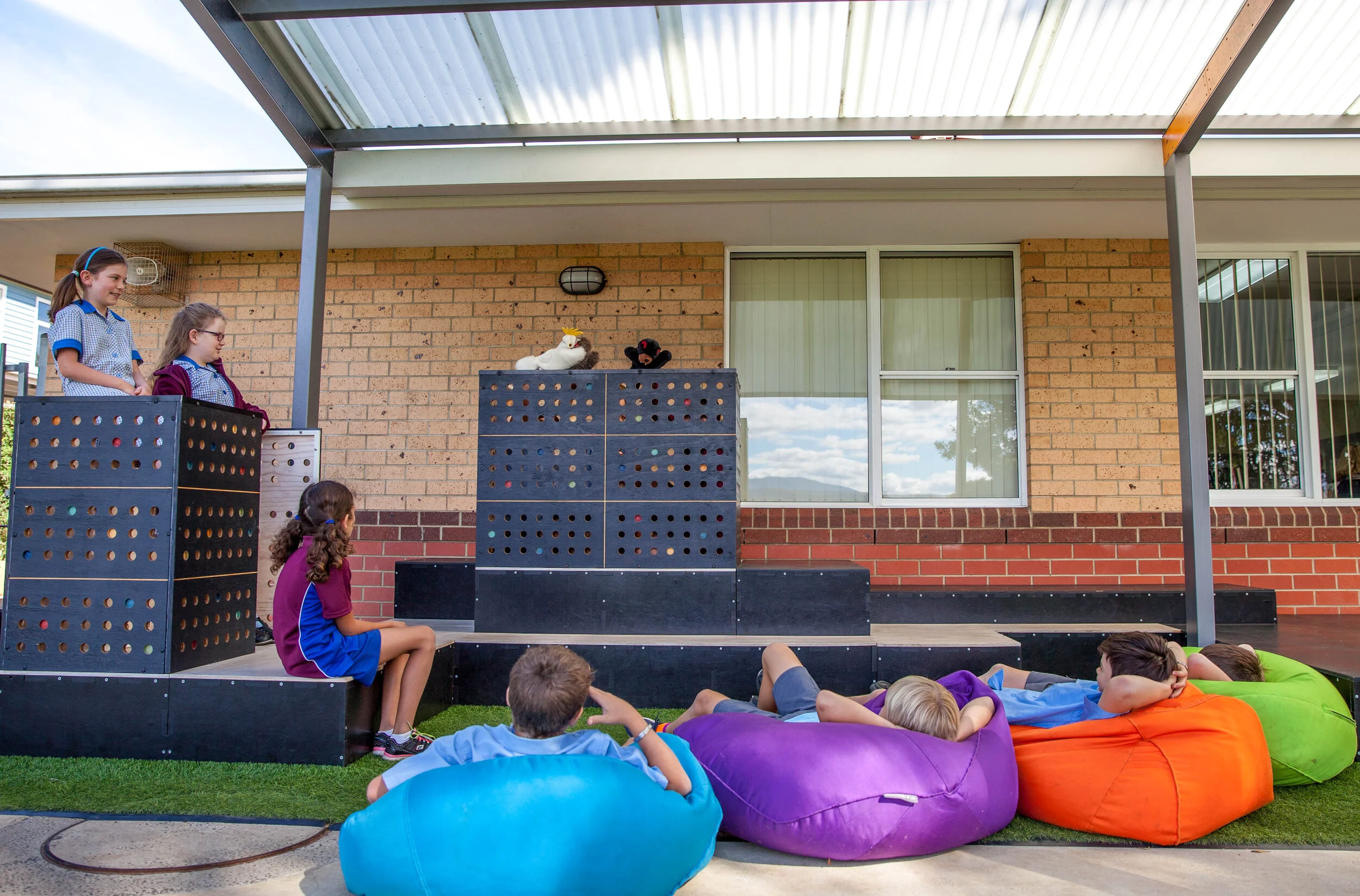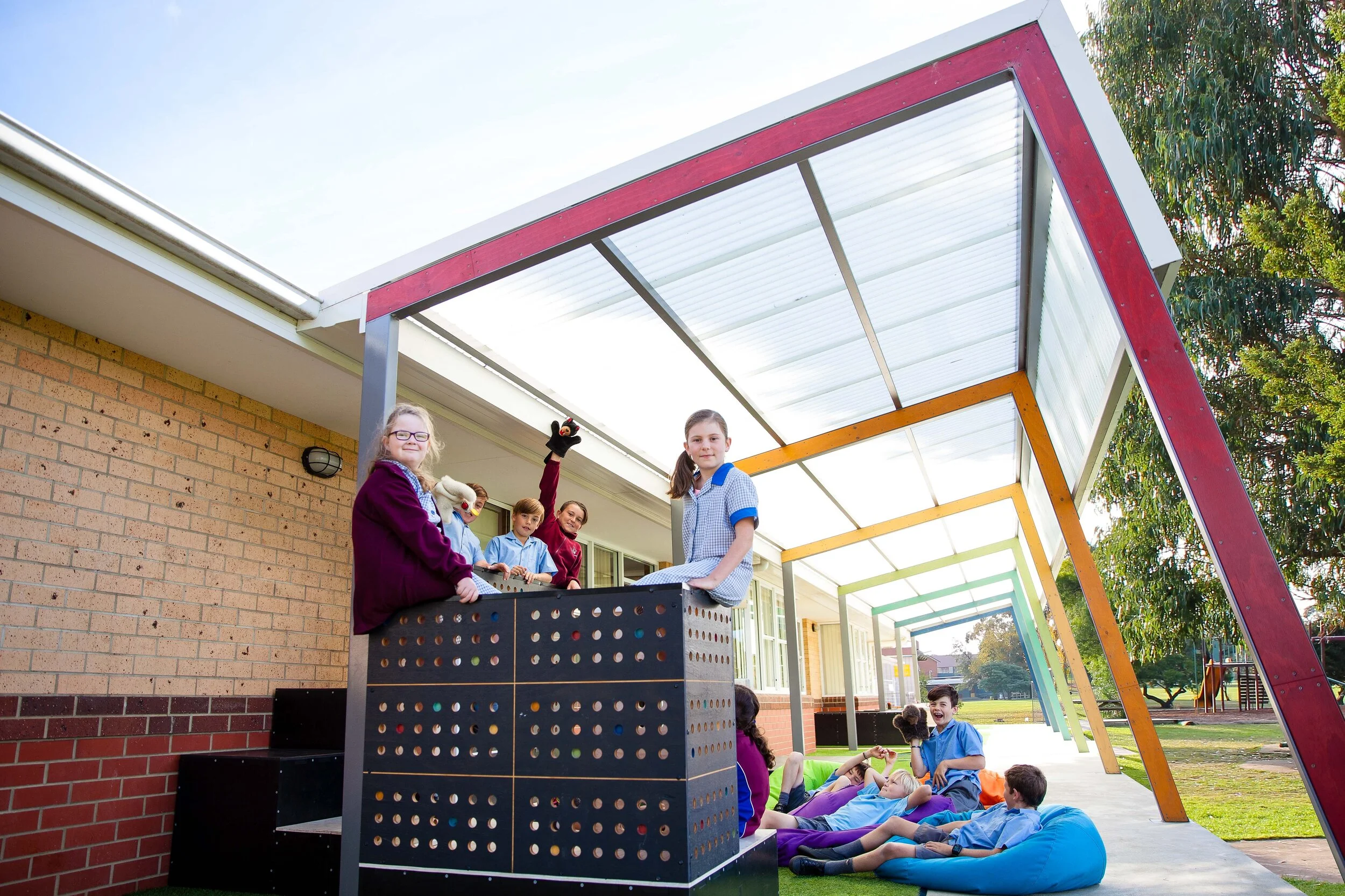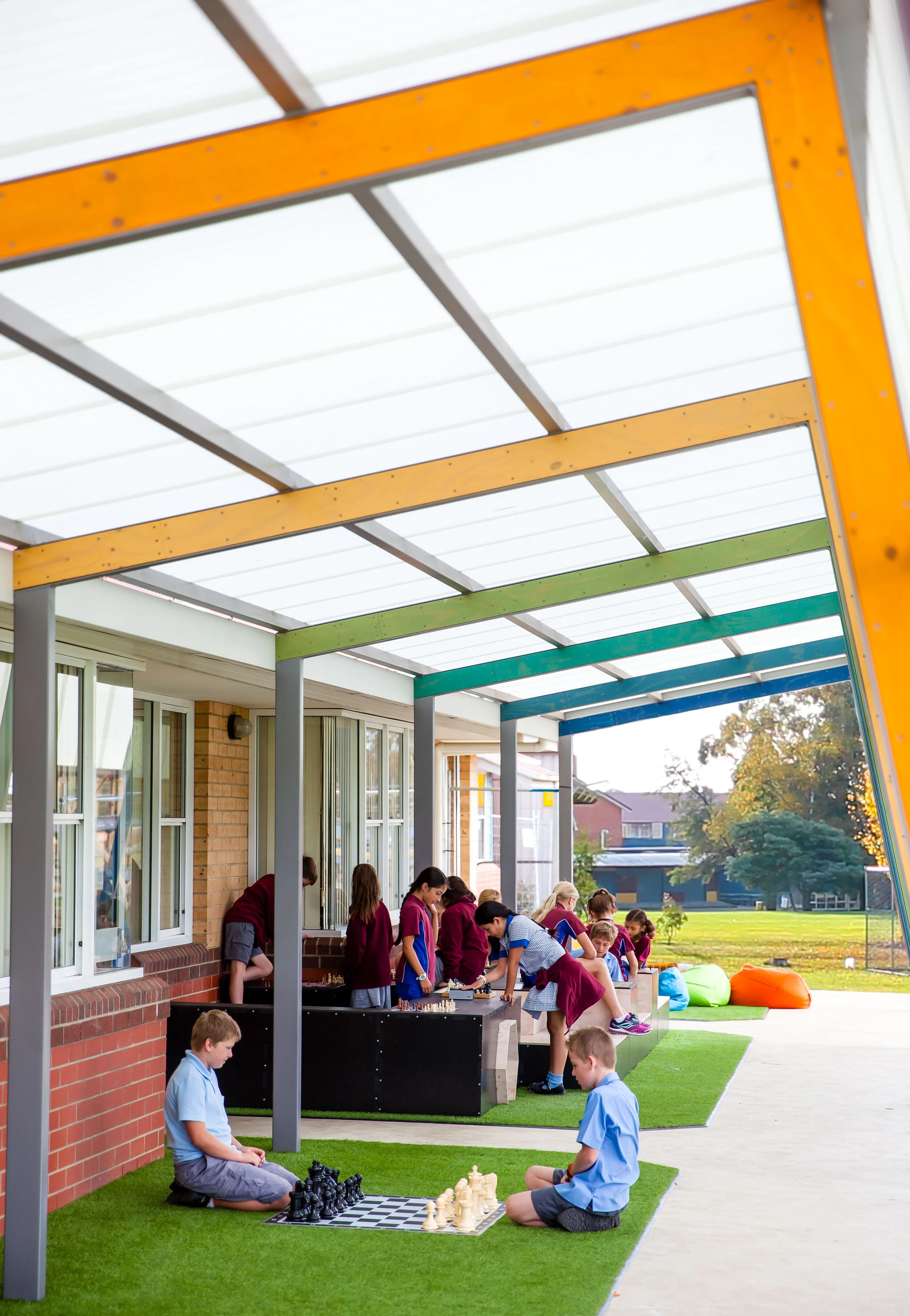 Over-sized columns, ground surfaces and plywood boxes define ‘zones’ of activity and offer varying degrees of spatial, visual and acoustic containment. The muted colour palette varies along the length of the verandah in response to different sensory preferences.